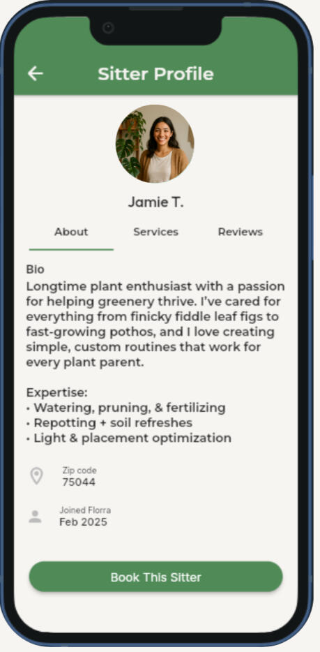 Florra is a marketplace for houseplant care — helping plant owners keep their plants healthy while enabling plant lovers to earn doing what they enjoy.The app includes sitter and owner profiles, booking, messaging, and secure payments — all in one.